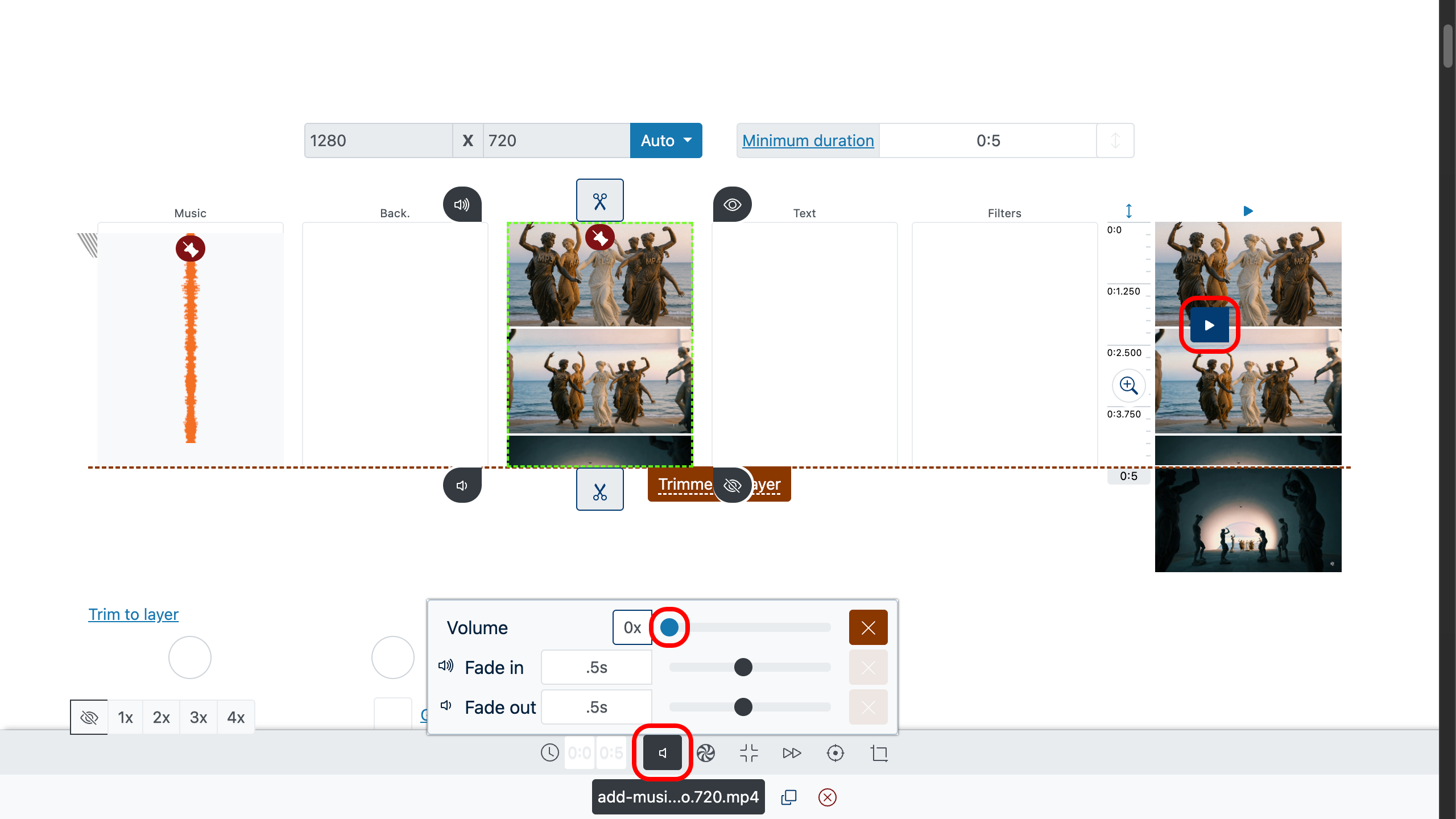 Use o volume para tornar a música de fundo mais baixa e destacar o áudio principal (diálogo, sons essenciais em cena). Baixe a música para que apoie a cena sem competir com ela.